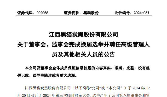 【炭黑產(chǎn)業(yè)網(wǎng)】12月26日消息,在12月26日晚間,黑貓股份對外宣布了重要人事變動消息。當日,公司第八屆董事會第一次會議及第八屆監(jiān)事會第一次會議順利召開,會議審議并通過了多項關鍵議案,包括選舉新一屆董事會董事長、聘任公司總經(jīng)理、副總經(jīng)理及財務總監(jiān),以及任命董事會秘書等。