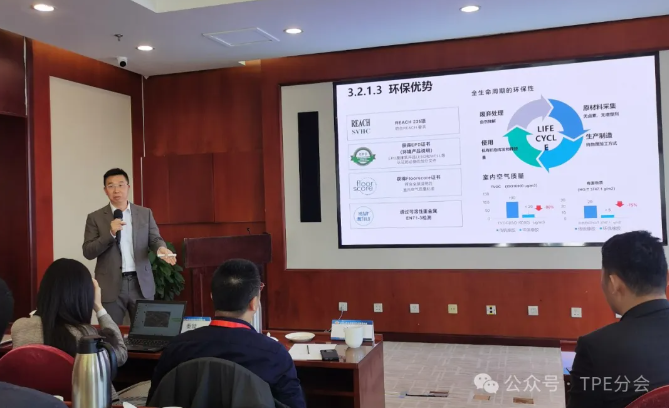 地面材料歷經天然材料、多種人工材料的發展歷程,目前已經進入現代環保材料成為地面材料發展方向的新時代,多類熱塑性彈性體憑借其獨特性能及應用優勢,成為了現代創新型彈性地材的明星產品。中國建筑裝飾材料協會彈性地板分會理事、中華人民共和國住房與城鄉建設部標準委員會專家、阿姆斯壯(中國)投資有限公司施展鵬研發與技術總監做了《熱塑性彈性體在地面材料的應用與展望》的精彩報告,報告從地面材料的發展沿革、傳統彈性地面材料介紹、創新型彈性體開發及應用現狀、熱塑性彈性體地材展望四個方面,全面、深刻剖析了熱塑性彈性體材料包括熱塑性苯乙烯類彈性體(TPS)、熱塑性硫化彈性體(TPV)和熱塑性聚氨酯彈性體(TPU)等在彈性地材領域的研發、生產現狀以及獨特的性能和應用優勢,熱塑性彈性體地面材料極具市場潛力,將是未來最具活力的熱塑性彈性體應用市場之一。